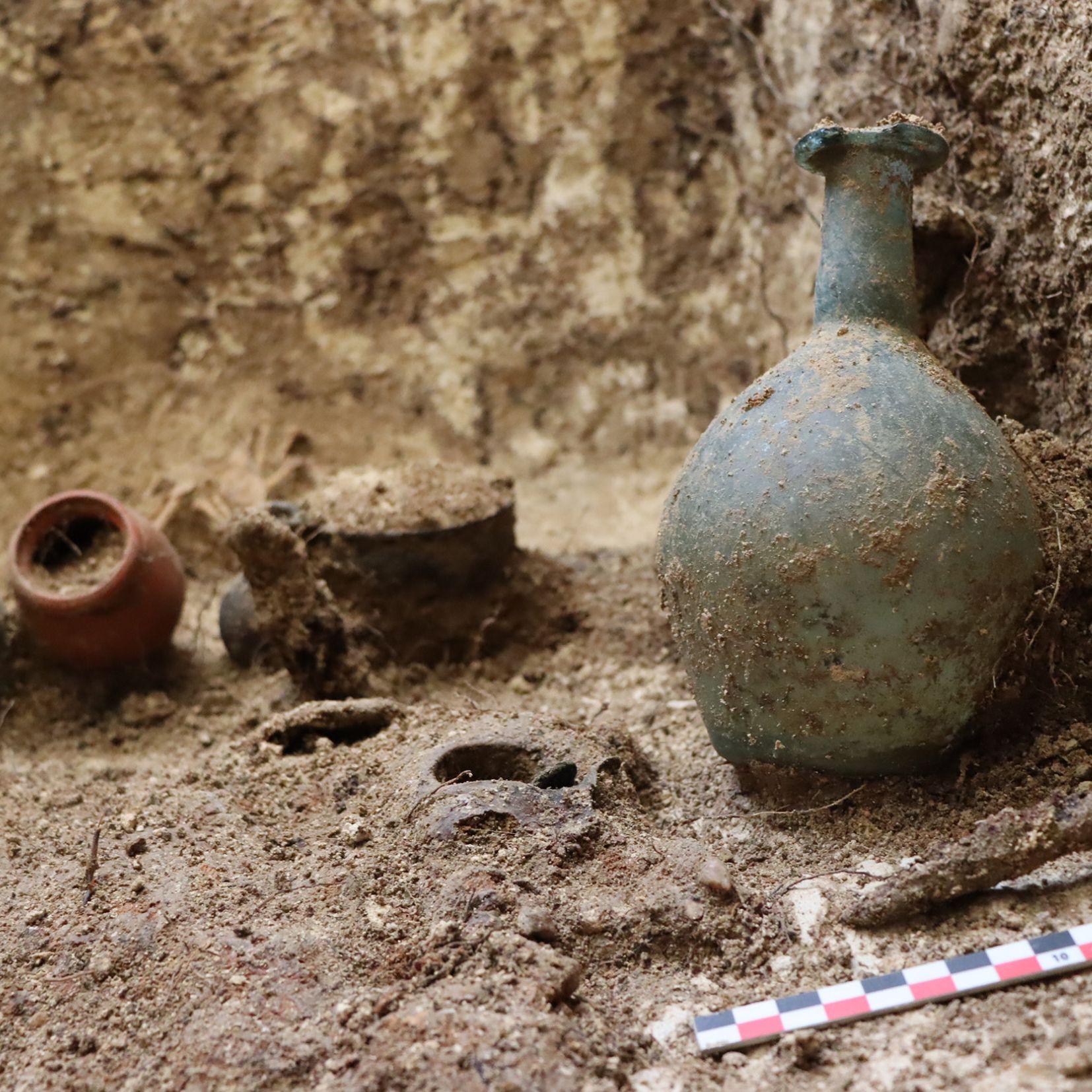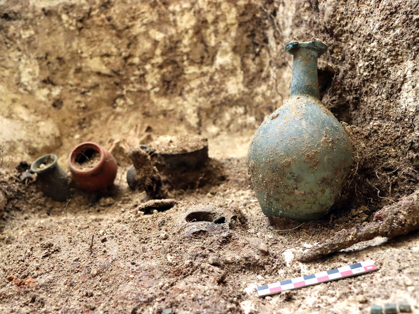 Visuel : Mobilier funéraire mis au jour dans une tombe de la nécropole antique de Pontoise. Service départemental d’archéologie du Val d’Oise, 2024.