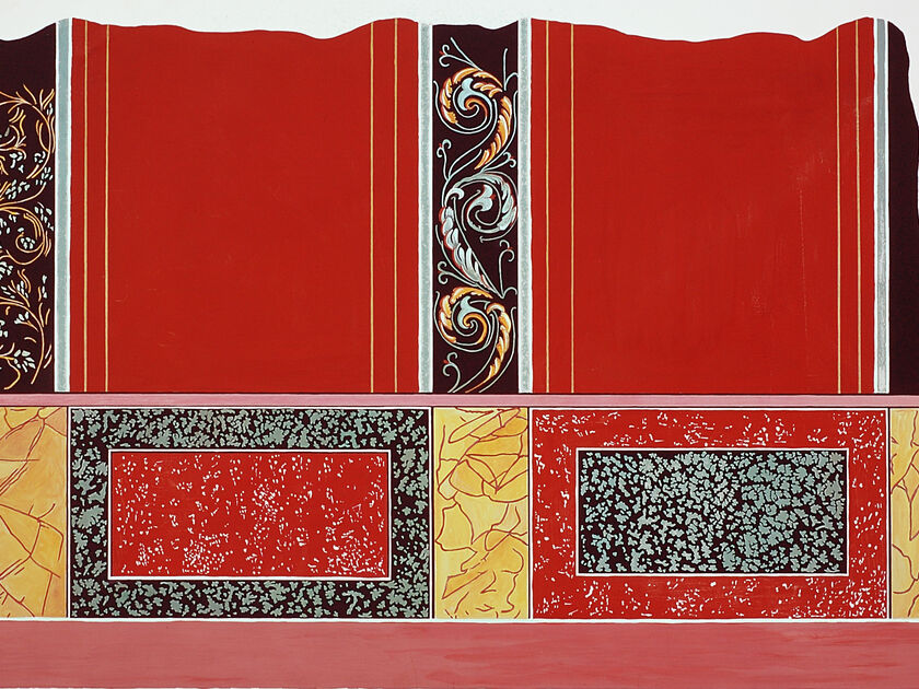 Décorer les murs d’une pièce c’est suggérer un monde différent de l’espace réel. Dans les maisons romaines, ce monde illusoire est luxueux : imitation de marbres précieux ou d’orfèvrerie. Mais c’est aussi, bien souvent, l’évocation d’un « au-delà de la paroi », d’une ouverture vers l’extérieur ; dans ce cas, les couleurs opaques (noir, rouge, jaune) alternent avec des ouvertures claires. Mais une autre tendance préfère refermer l’espace sur lui-même et privilégier les grands panneaux unis animés de motifs décoratifs. À l’intérieur de ces deux options, la couleur rouge joue un rôle prédominant : affirmation de surfaces fermées, ou mise en scène d’un monde de l’illusion.
